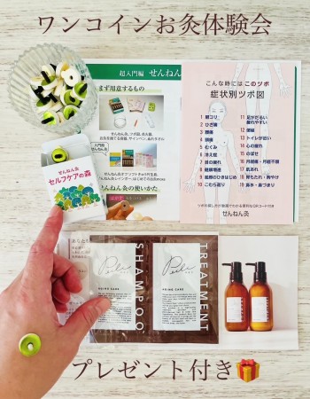 【ご予約不要】ふらっと立ち寄って、肩こりと目の疲れに効くお灸を体験してみませんか? 参加された方には、自宅で簡単に出来るお灸とヘアケアセットをプレゼントします。 店舗内でいろんなイベントも楽しめます♪