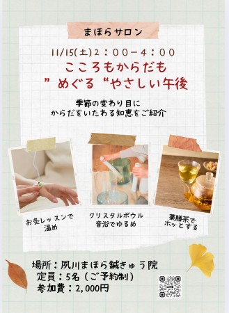お灸レッスンでセルフケアを学び、クリスタルボウル音浴と薬膳茶でリラックス。 心身をやさしく整える、季節の変わり目にぴったりのまほらサロンです。